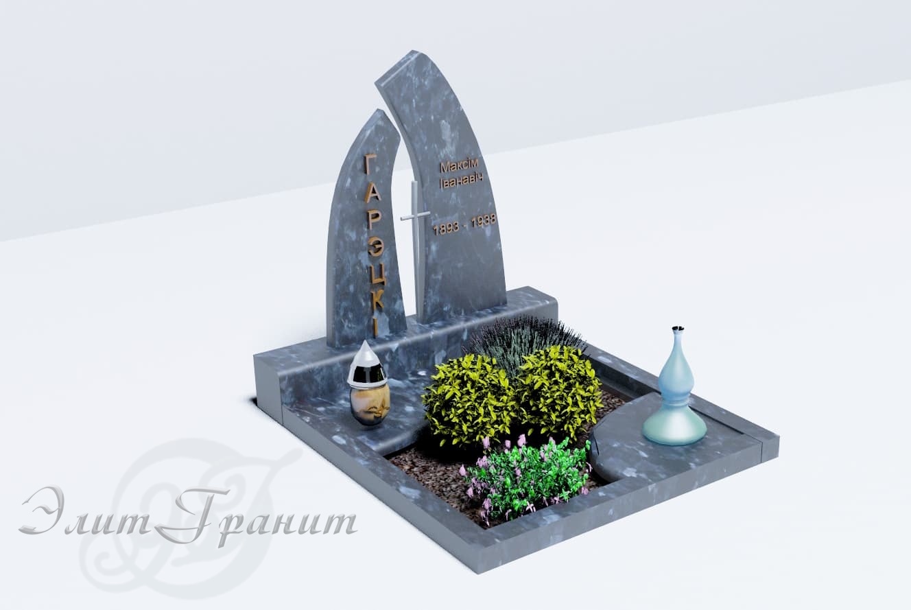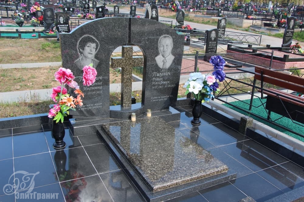 Основная стела из темного гранита. На ней размещают фамилию, имя умершего, даты жизни и эпитафию. Если памятник на двоих, то основную стелу продублируют.