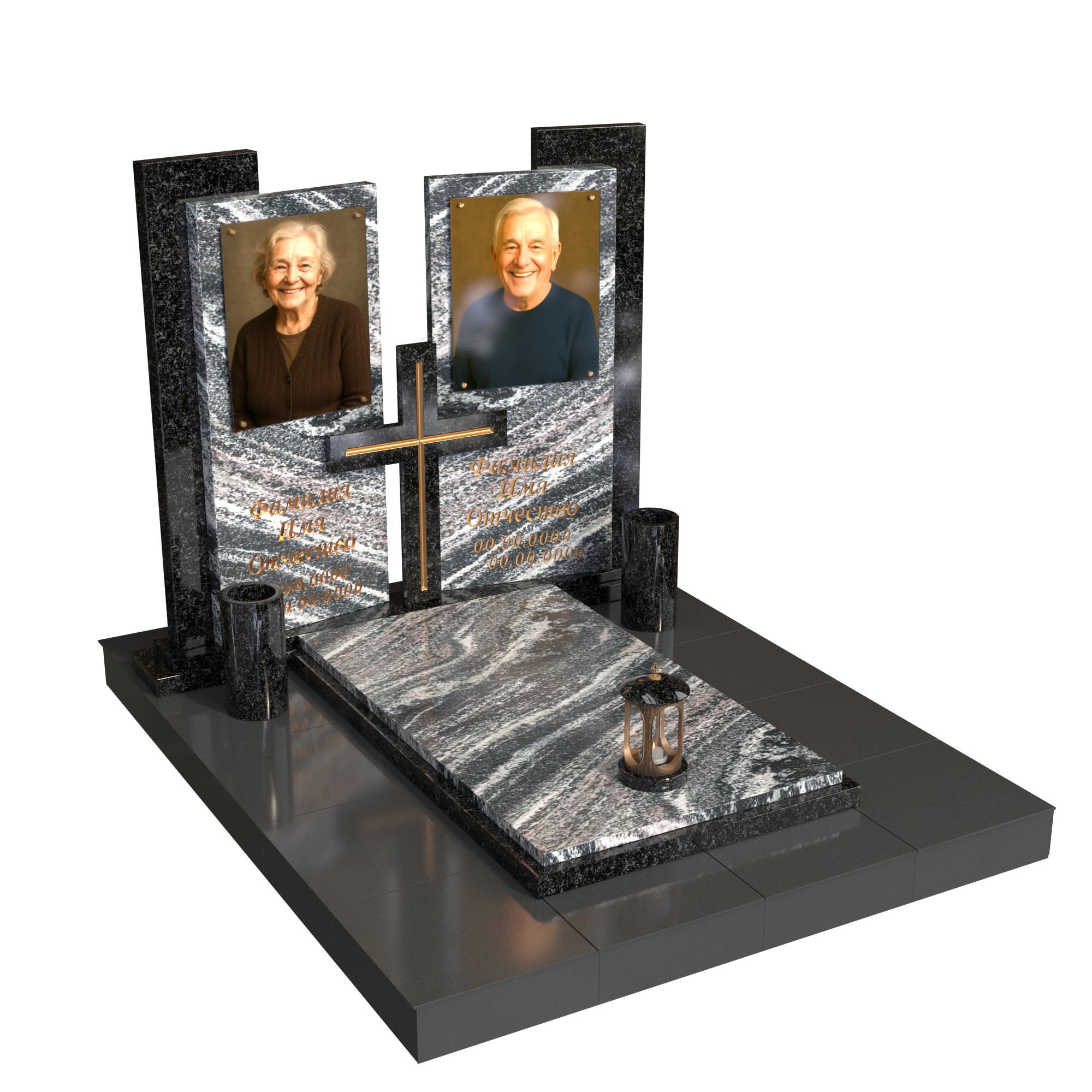 Парный памятник «Союз памяти» — современный мемориальный комплекс для двух захоронений. Две вертикальные стелы объединены центральным крестом, символизирующим духовную связь и единство семьи. В каждой стеле — фотопортрет на стекле (крепление на метизах) и индивидуальная гравировка. Ухоженный подиум, две цилиндрические вазы и лампада на плите создают законченный, торжественный образ.
