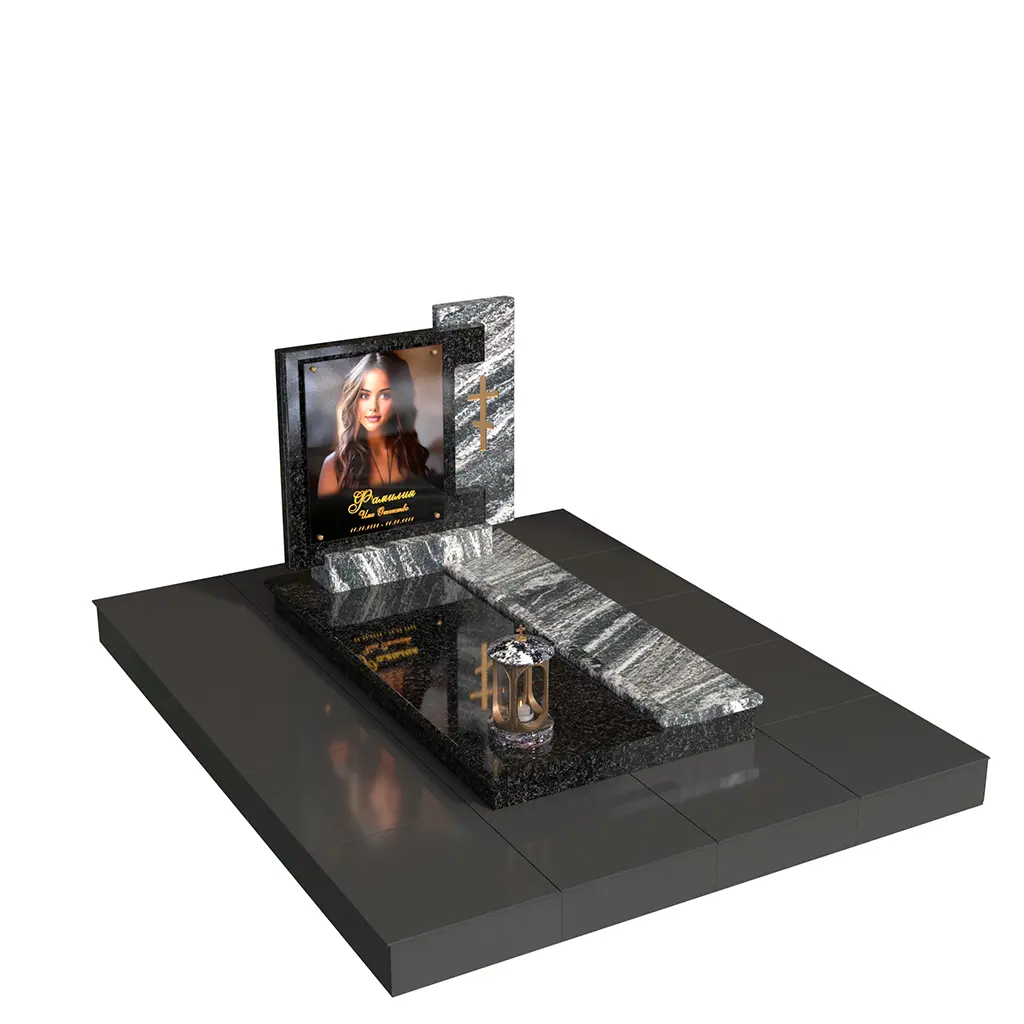 Памятник «Отражённый свет» — современный мемориал из натурального камня с выразительным контрастом фактур. Низкая горизонтальная композиция дополнена лаконичной вертикальной стелой: в центре — фотопортрет на стекле (крепление на метизах), справа — строгая каменная плоскость с аккуратным крестом. Двухуровневая плита, продуманная геометрия кромок и лампада на подиуме создают цельный, ухоженный вид участка.