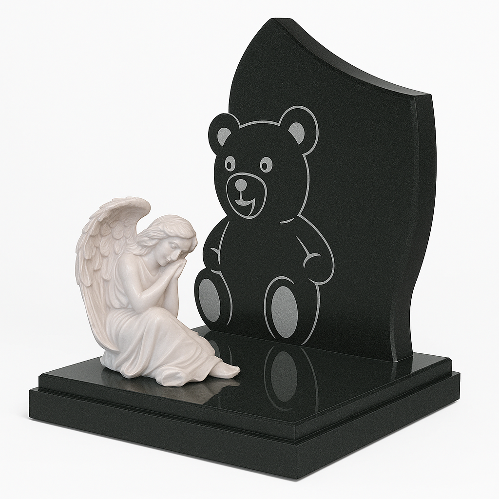 Памятник для ребёнка может быть выполнен из различных пород гранита, мрамора, габбро. В качестве оформления могут быть использованы бронзовые буквы и декор Caggiati (Италия) либо гравировка.