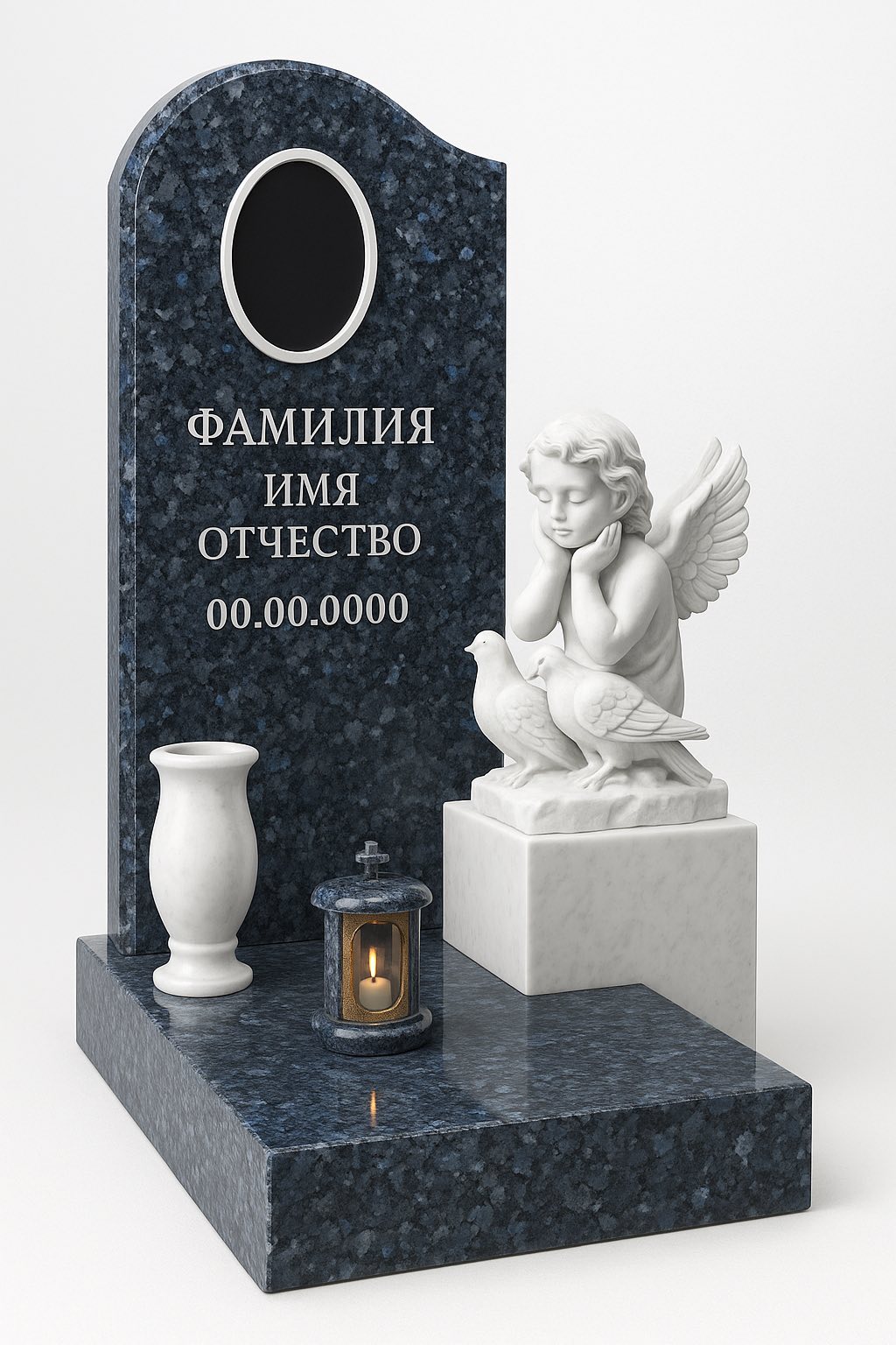 Трогательный и выразительный памятник, выполненный из норвежского гранита Blue Pearl OM с сияющими сине-чёрными вкраплениями, в сочетании с белым мрамором, символизирует чистоту, покой и вечную память.
