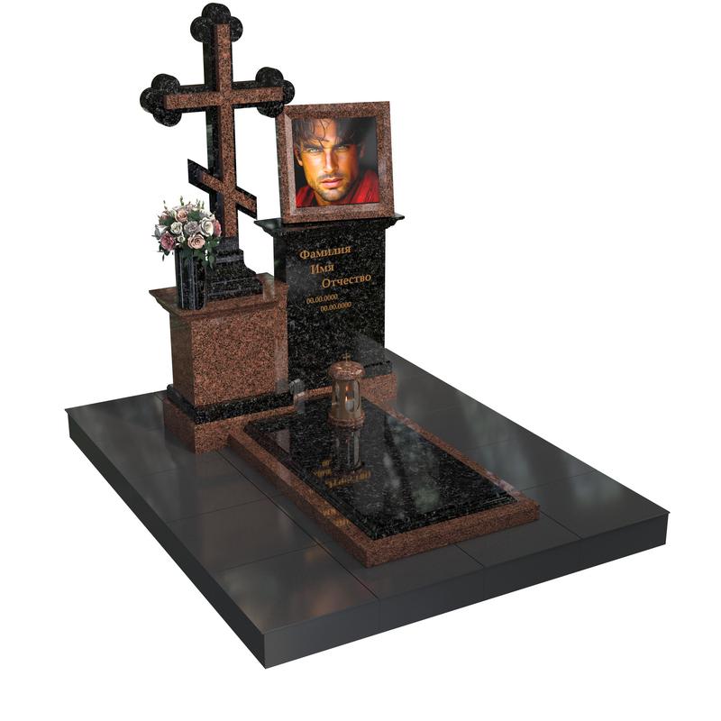 Центральным элементом композиции служит массивный крест — символ духовной опоры и вечной жизни. Рядом расположена стела с портретом и надписью, установленная на устойчивом постаменте. Надгробная плита, лампада и ваза с живыми цветами формируют цельный образ, передающий уважение, веру и бессмертную память.