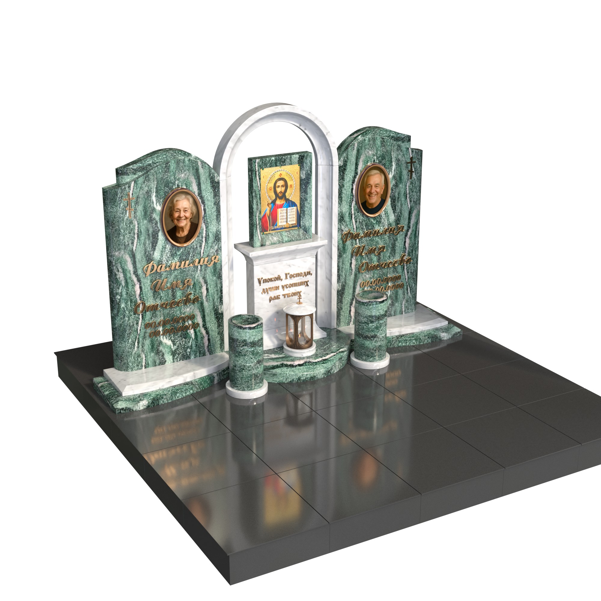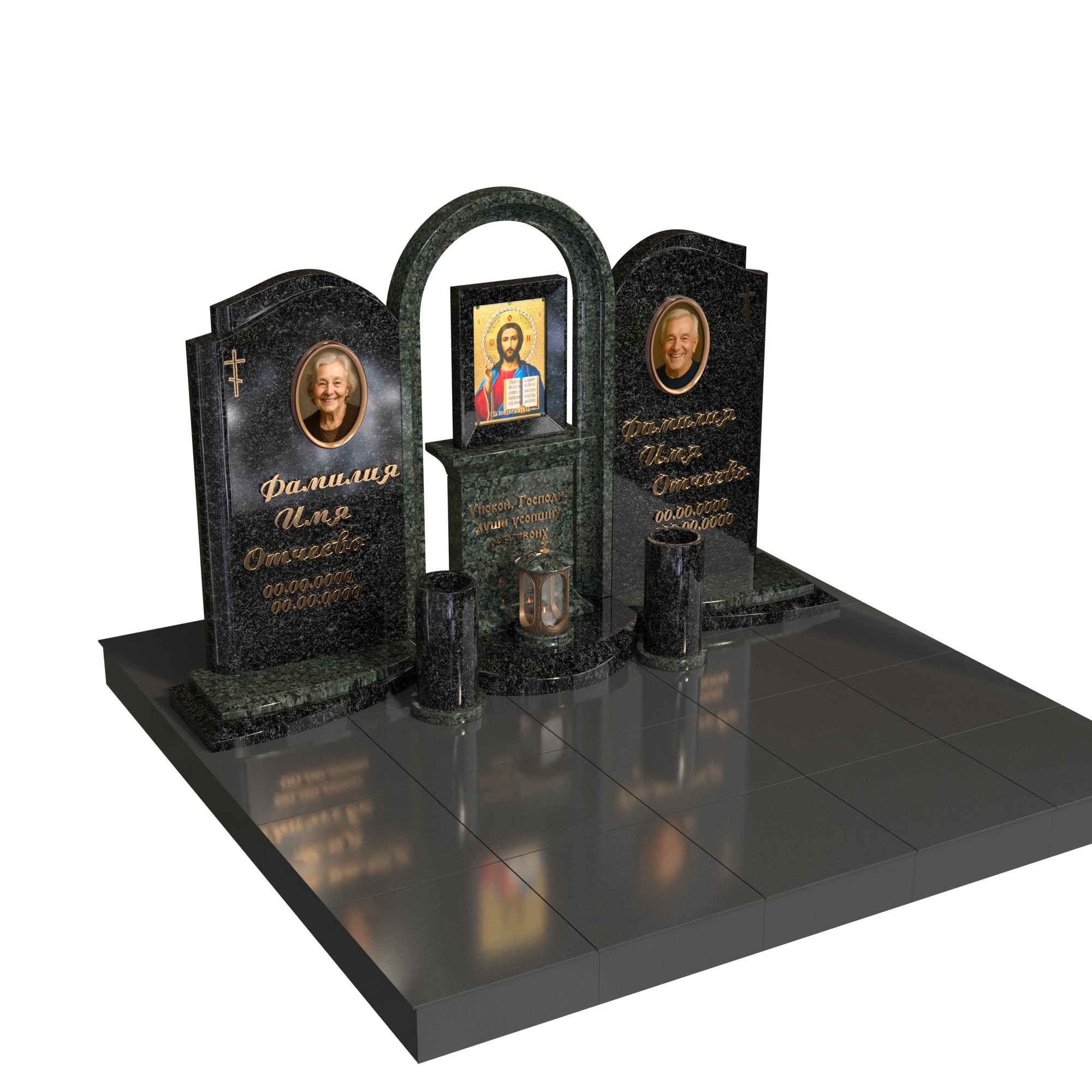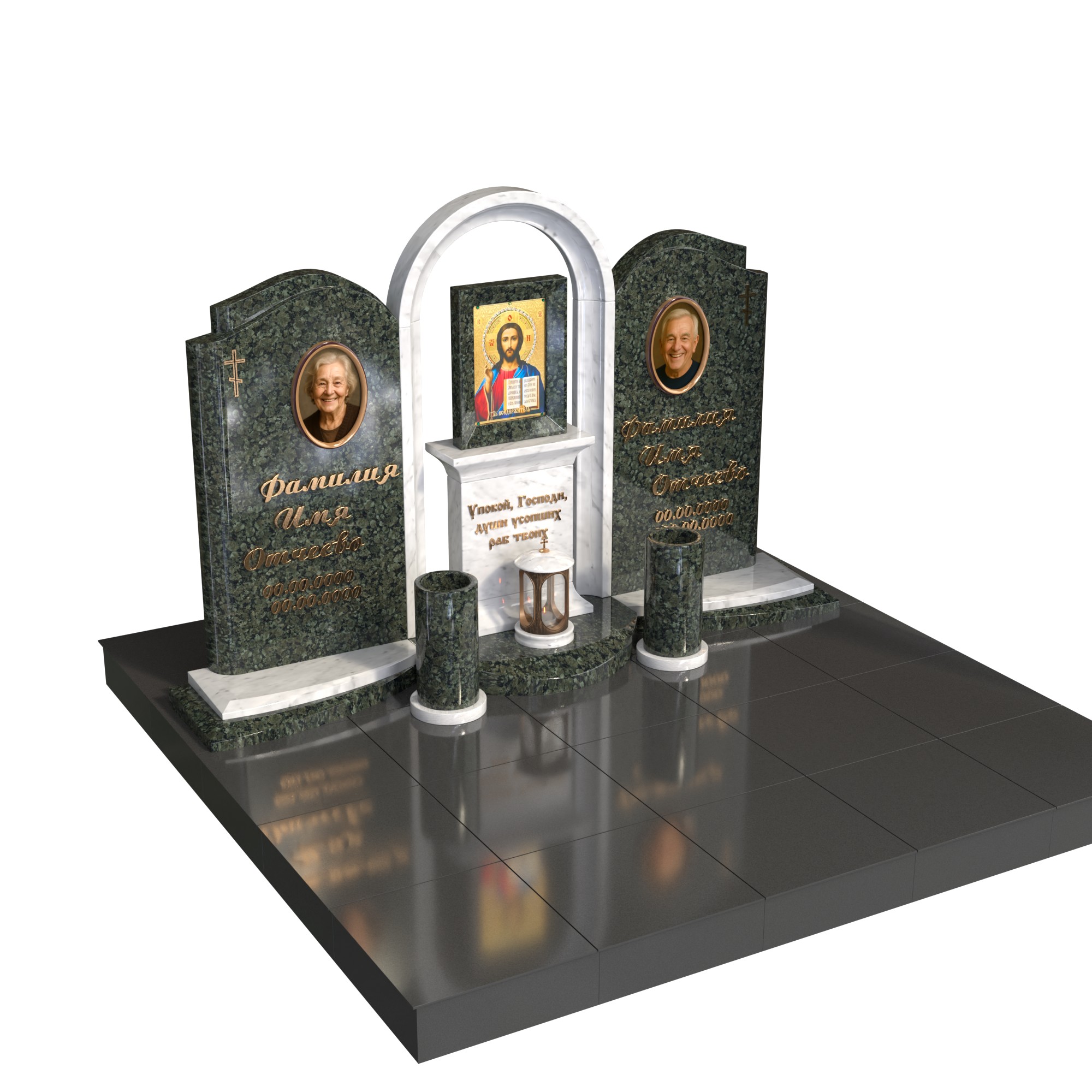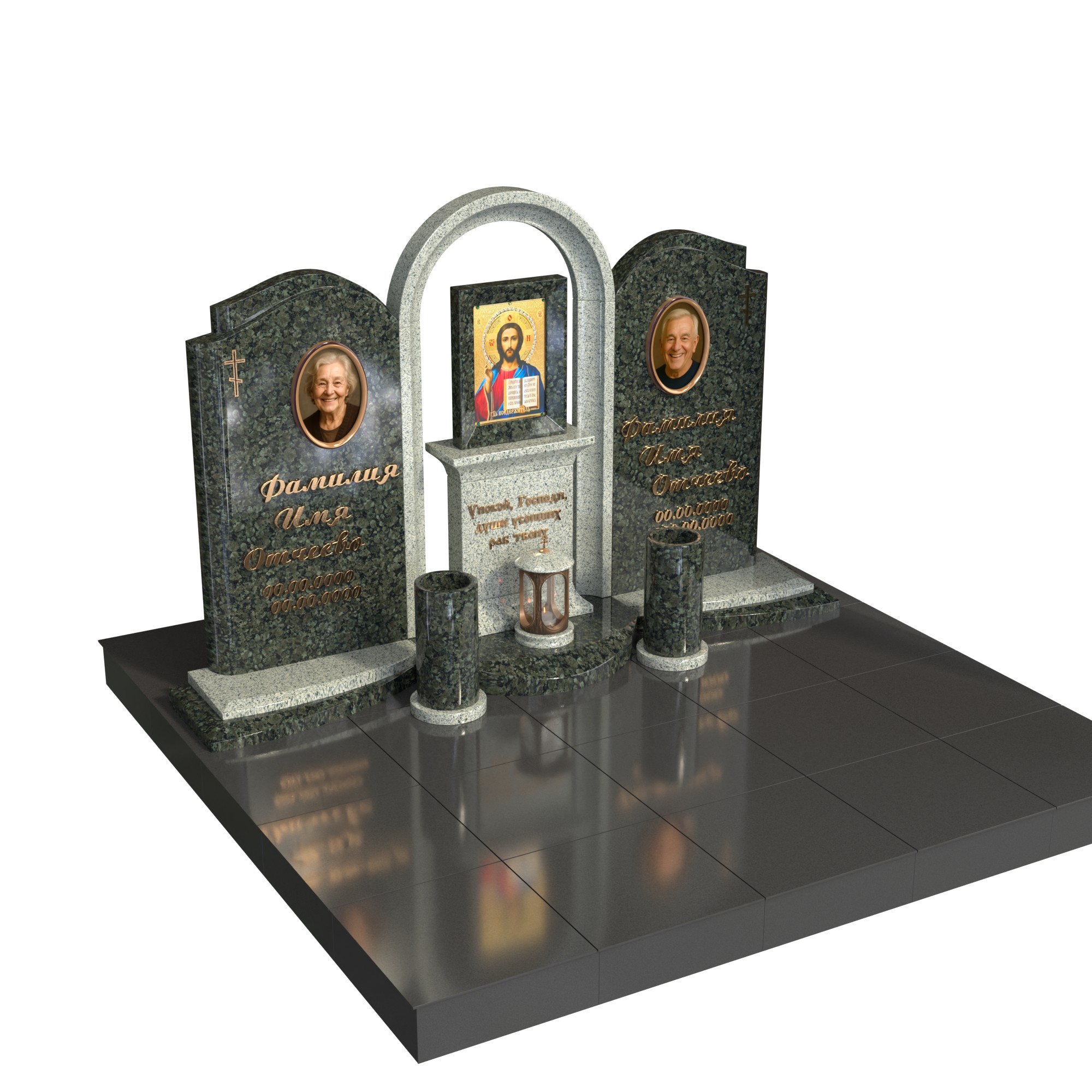 Парный памятник «Храм памяти» — торжественный семейный комплекс для двух захоронений. Две вертикальные стелы с овальными фотопортретами объединены центральной аркой-часовней с нишей под икону и лампадой, что подчёркивает веру, любовь и единство семьи. Ухоженное основание, плавные подиумы и две вазы формируют гармоничный, завершённый облик участка.